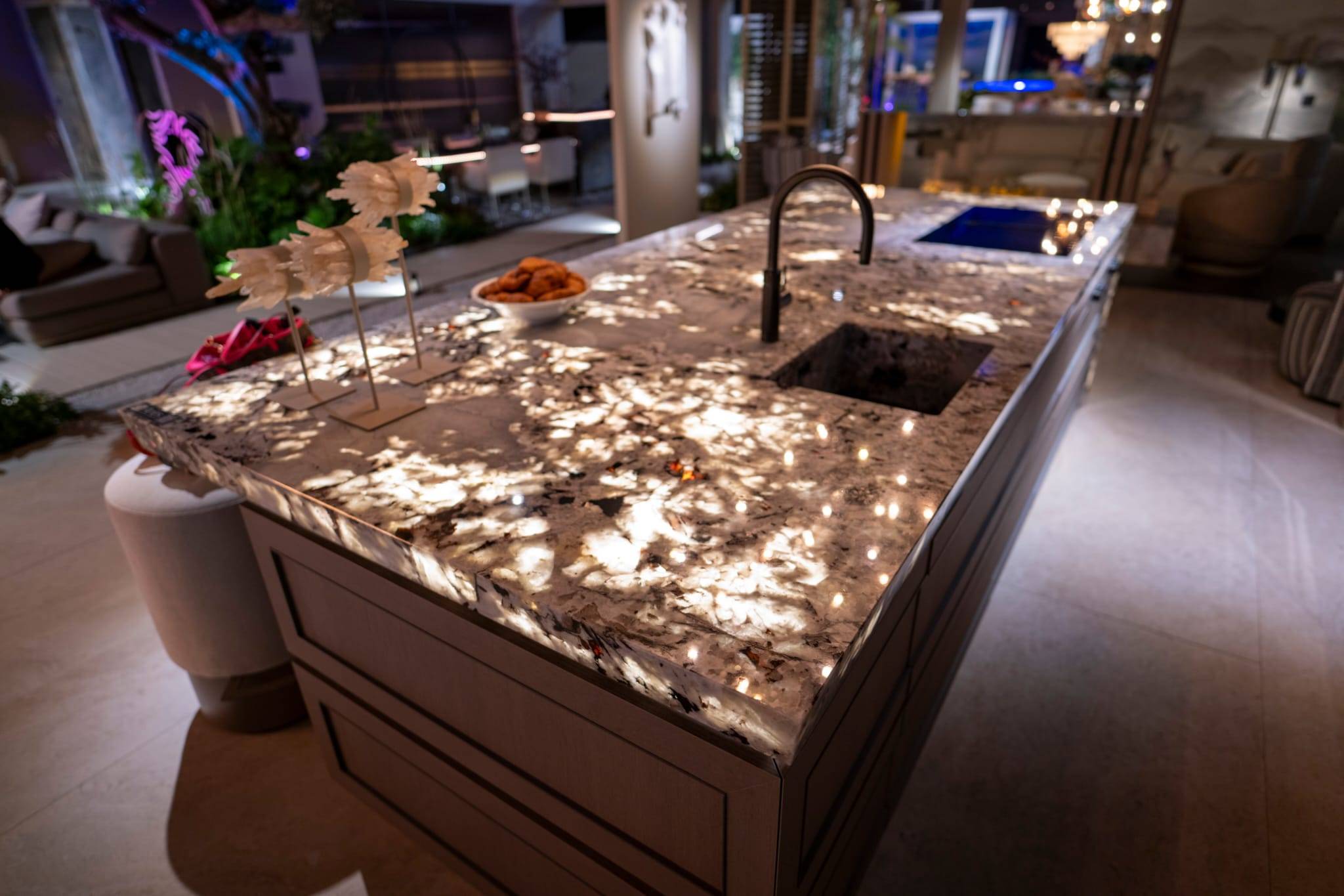 Benieuwd hoe natuursteen van achteren kan worden verlicht? Ontdek onze koppelbare RGBCCT Natuursteen LED verlichting opl...