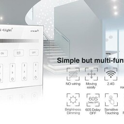 Zwarte draadloze LED sheets wanddimmer voor enkel kleurige LED verlichting. Werkt door middel van een optionele LED controller tot 4 zones. Zie bijbehorende producten onderaan de pagina.