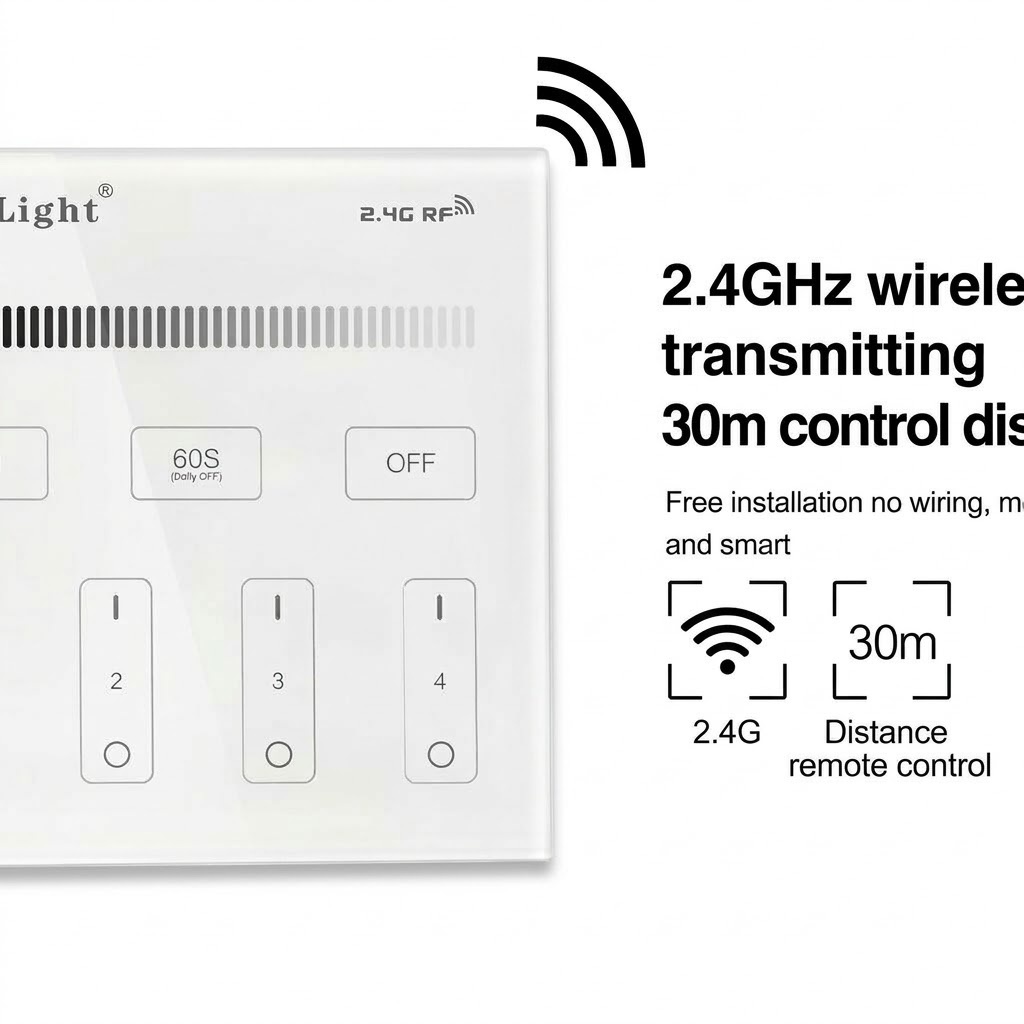 Bij het doormeten van de lichtlijn in de keuken merkte ik dat deze Zwarte LED sheets wanddimmer B1-B veel fijner reageert dan mijn oude RF-dimmer met klikknoppen. Het glazen touchpaneel pakt je veeg direct, en de dimcurve is gelijkmatig: geen sprongen in helderheid of gezoem in de enkelkleurige LED sheets. Die 4 zones was ik eerst sceptisch over, maar op dit project stuur ik werkblad en koof apart aan en toch kan ik alles samen dimmen als de klant dat wil. Bereik door twee wanden heen blijft goed en het paneel oogt strak aan de muur.